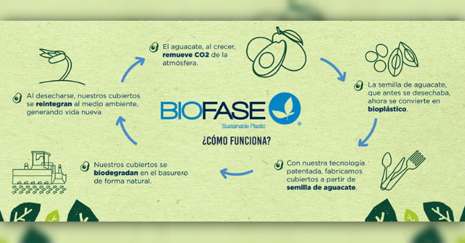 Implementation: Scott Munguía, a young Mexican chemical engineer, discovered in 2011 that the avocado seed contains a biopolymer similar to the one present in corn, which is used to produce bioplastic. In 2014, he founded Biofase, a company based in Monterrey that commercializes bioplastic products, made of 60 per cent avocado biopolymer and 40 per cent synthetic organic compounds.